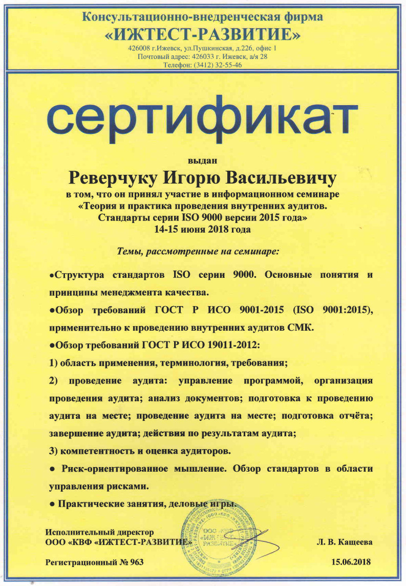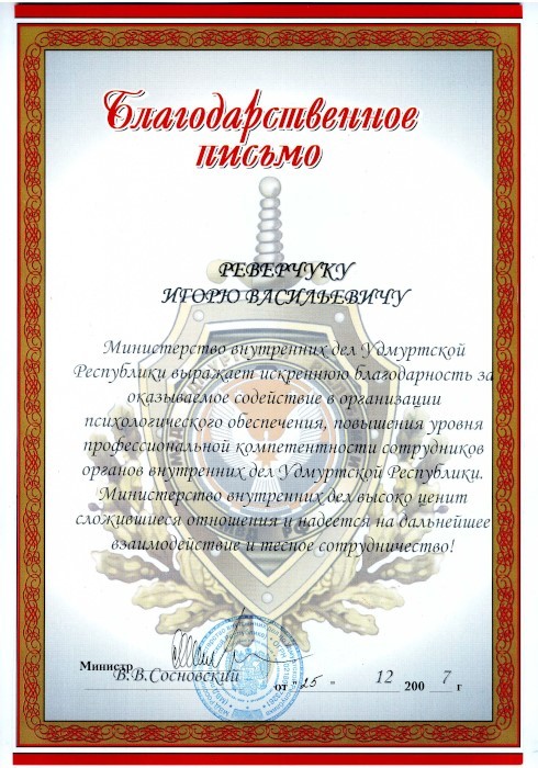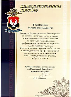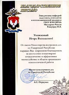 - Оказал регулярную методическую помощь в организации лонгитудного повышения квалификации руководителей подразделений МВД по УР по профилактике девиантного поведения, суицидов и профессионального «выгорания» у сотрудников силовых структур и ЦПД МВД по УР и ФСИН по УР